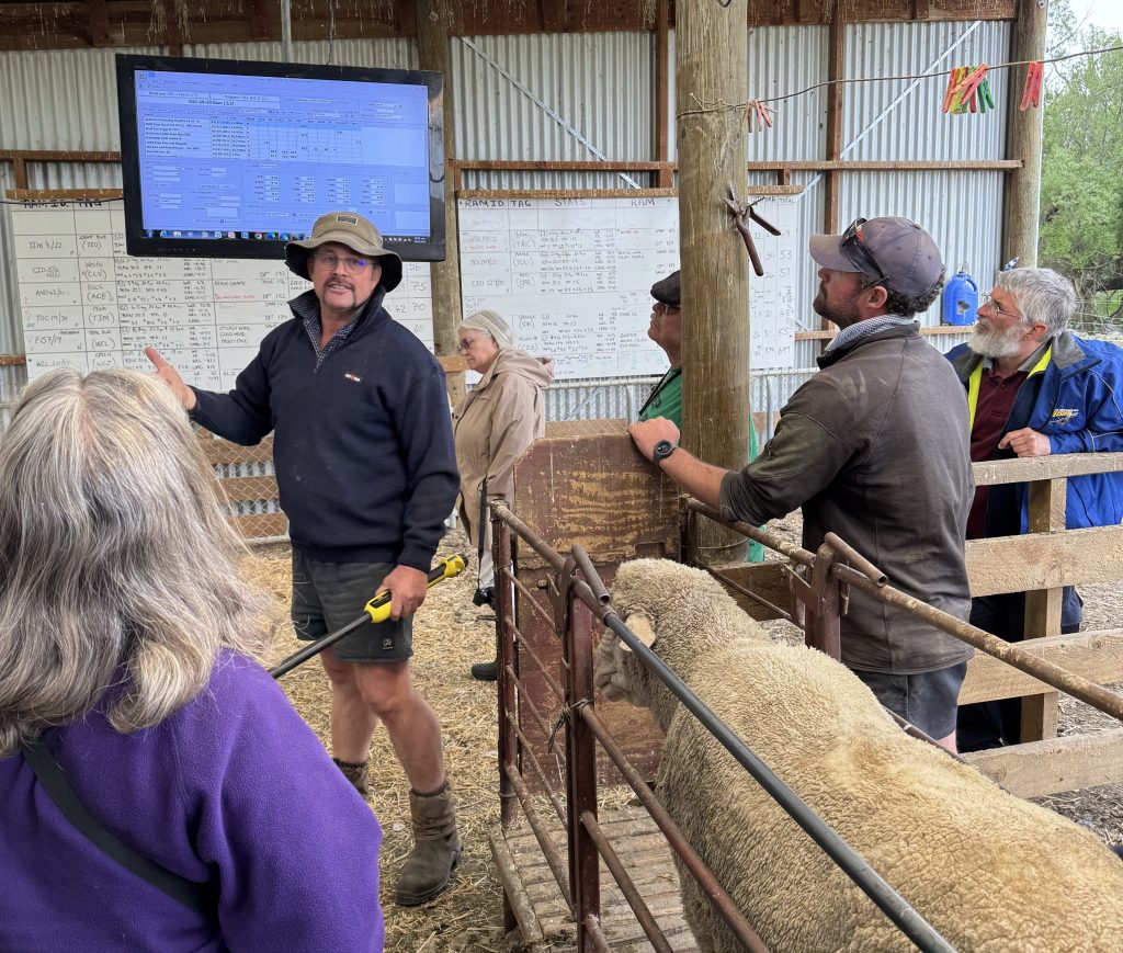 Next we met David and Viv Strong of Chudleigh Polwarths. They aim for 21-25 micron fleeces in their mainly natural colored flock, and had their recently crowned supreme champion colored fleece on display in their wool shed along with some other beautiful fleeces from their very successful program.